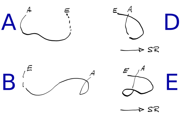 Eine Grafik kommt mir allerdings etwas seltsam vor (nachgemalt, um Copyright-Problemen aus dem Weg zu gehen): Bildinhalt: Biomechanik des Schwimmens, Handweg A und D beziehen sich aufs Kraulen. B und E beziehen sich aufs Rückenschwimmen. Die schwarzen Buchstaben haben folgende Bedeutung: SR - Schwimmrichtung E - Eintrittspunkt der Hand A - Austrittspunkt der Hand Abgebildet ist hier die seitliche Sicht auf den Weg eines Lichtpunktes, den man sich beim Schwimmen an der Hand befestigt vorstellt. Dabei ist jeweils links (A u. B) der zurückgelegte Weg der Hand relativ zum Körper aufgemalt und rechts (D u. E) der Weg relativ zum Schwimmbecken. Was ich dabei etwas verwirrend finde, ist die Kurve "B". Mir scheint, dass hier die Schwimmrichtung von den anderen Kurven abweicht und nach links geht. Warum macht man denn sowas? :confused: |