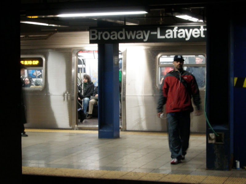Auch der nette Herr in der roten Jacke steigt um, allerdings in die andere Richtung. Ist auch er auf einem field trip? Kann man einen field trip ueberhaupt alleine bestreiten? Einen kurzen Augenblick posiert er fuer die Kamera, bringt sich in Position, um dann urploetzlich wieder New Yorkerisch gelangweilt dreinzuschauen. Seine linke Hand scheint kalt zu sein. |