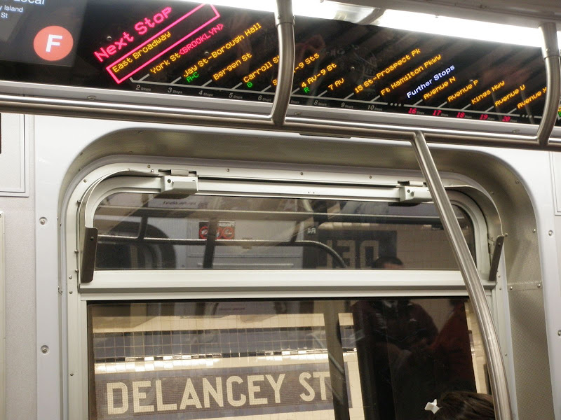 Field trips sind nie ohne Gefahr. Per Augenkontakt verbuendete ich mich mit dem netten Herrn links und der Dame gegen den potentiell gefaehrlichen Mann in der Mitte. Irgendetwas sagte uns, dass der nicht ganz Koscher ist. Dank meiner zwei Aufpasser, hatte ich nun mehr Zeit, mich mit dem neuesten amerikanischen Heitek zu befassen. C und F train sind mit einer ultramodernen Stationsanzeige ausgeruestet, wie sie ausser in Deutschland, England, Frankreich, Italien, Japan, Kanada, Kirgisien, Usbekistan, Tschad, Botswana, Uganda und dem Pazifik Atoll Kikikiki nirgends zu finden sind. Mit dieser Hilfe ist die Orientierung fuer den field tripper deutlich leichter. Er ist nicht angewiesen auf die im bronxianischen Urvolkdialekt genuschelte Sprachansage des Lokomotivfuehrers, sondern kann sich ganz der visuellen Hilfe bedienen. Vorausgesetzt der gefaehrliche Mann ist unter Kontrolle. Und voraussgesetzt die komplette field tripper Truppe ist nicht der Blindenverein auf Luftschnupperexkursion. |
