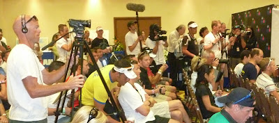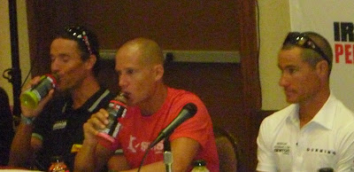 Die Pressekonferenz war dann erwartungsgemaess stinklangweilig (was solle die Leit auch gross sagen?), aber hingehen musste ich natuerlich trotzdem. Die Erkenntnis: Greg Welch ist ne coole Sau. Der hat den Amis furztrockene Sprueche gedrueckt, so dass die mit ihrer PC gar nicht mehr wussten, wo vorne oder hinten ist. Richtig geil. Schon vorgestern, als Amanda Balding und Luke McKenzie Frau dude und mich ihm vorstellten ("newly weds!"), meinte er nur trocken: "Do you know the three rings of marriage?" "Engagement ring, wedding ring, suffering!" Interessant war dann vielleicht noch die Aussage von Chrissie auf die Frage, ob sie sich denn fitter fuehle, als im Vorjahr. Mit ploetzlich todernster Mine sagte sie: "I'm fitter. I'm stronger. I'm faster." Das war mal ne ganze andere Frau, als man sie sonst sieht. Doch ihr britischer Humor kam schnell wieder raus, als Greg Welch meinte, er wuerde die CD kaufen, auf der sie ja nun mitsinge. Er brauche sich nicht zu sorgen, sie haetten ihr versprochen, dass die Techniker so lange an ihrem Gesang schraubten, bis es hoerbar klinge. "Just like the photographers who always promise to make me look good." Greg Welch: "You're all right. You're not bad." Ich hab' mich fast bepisst vor lachen, v.a. weil's die Amiaffen um mich herum nicht gepeilt haben. Fuer "zee Germans" hab' ich Andreas Raelert gefilmt. http://www.youtube.com/watch?v=JyHIqKFVE5k Reli schoepfte Kraft aus meinem Anblick (ich war oben ohne an der PK, eh' klar), waehrend Lieto kurz davor war die Fassung zu verlieren, dann verlor und... ...schnell synchron-rehydrierte mit dem widerlichen Eiermanngesoeff, das ich hier auch taeglich trinke: Kein Wunder hab' ich wieder zugenommen. |