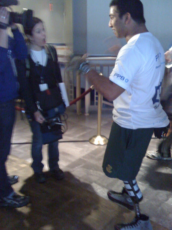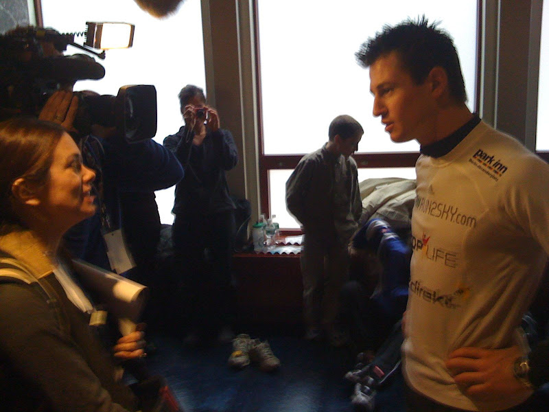 Der Trick liegt anscheind darin, sich mit beiden Armen affengleich hochzuziehen. Ich war ca. auf dem 60. Stockwerk als die Uhr 10 Minuten zeigte und dachte "Shit, die sind schon im Ziel!" Abartig. Aber ich hab' alle meine Ziele erreicht: sub 15 (14:20), alles gelaufen und v.a. Wade heil geblieben. Es war ein geiles Erlebnis! Aus der U-Bahn raus der erste Blick auf's Gebaeude: Mein schaerfster Konkurrent: Thomas Dold "Huh, was schwaetzt die da?": |