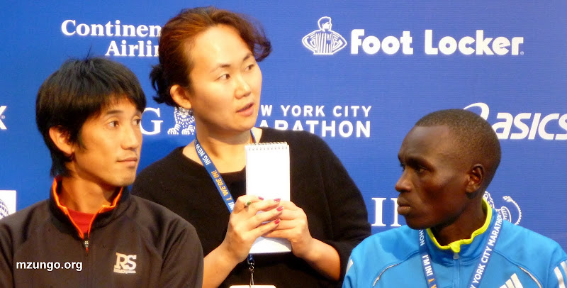 Da kannste sagen, was Du willst, aber wenn Du mal einen gespraechigen Kenyaner erwischt, gibt's nix besseres. Wie erkennt man die? Statt nur Jogginganzug und Laufschuhe auch mal was anderes. Abel Kirui war heute mein Opfer in seiner Afrika-style Lederjacke. Der Weltmeister von Berlin ist ein cooler Fuxxer. Das Interview gibt's spaeter auf Mzungo. Ich glaub' da stell' ich mal das Audio rein.