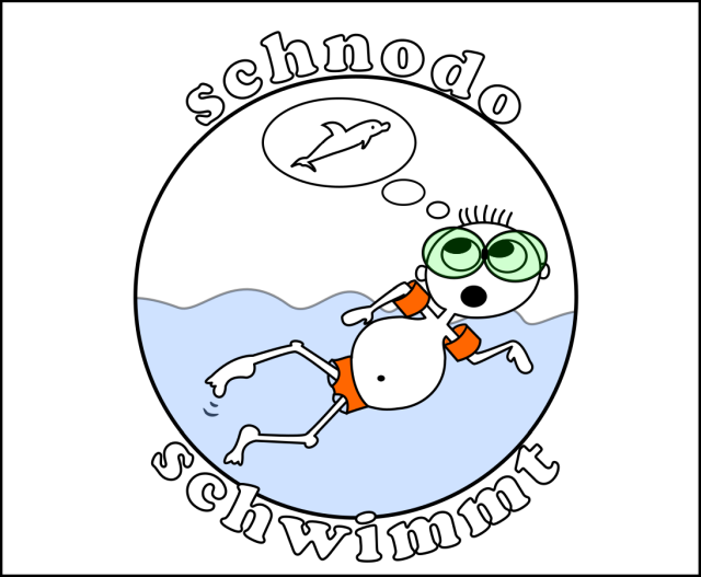 Zum Glück darf ich wieder. Das wasserdichte Pflaster am Bauch hält gut, das am Ohr musste ich erneuern. Weil ich für die Flussschwimmer-Bademoden gerade mit Inkscape am herumspielen war, habe ich mein Logo im Vektor-Format angelegt. Wenn ich öfter mal eine Badehose für mich entwerfen will, sollte das schon halbwegs ordentlich gestaltet sein. Die Gattin meint aber, dass die Schwimmbrille komisch aussieht. Da muss ich mir noch was einfallen lassen... Bildinhalt: "schnodo schwimmt" Logo |