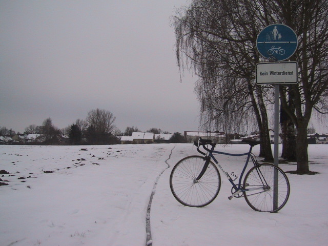 Sowas bräuchte ich hier jetzt so dringend wie´n Pfeil durchn Kopf. Mein Holz geht langsam zur Neige und ich hab keinen Bock, meinen Anhänger unterm Schnee auszugraben, um neues zu holen. Dafür hab ich dann doch nachm Laufen und nem Kaffee die Hühner nochmal gesattelt und bin mitm Eingänger los. Endlich mal wieder fix! Hier kann ich das Bild ja einstellen. Bei den Eingangspezies werd ich gesteinigt, wenn ich diese Bahnnaben auf der Strasse und bei Salz und Schnee ausführe... Kein Winterdienst? Absolut richtig. Kenn ich aber eh vom Laufen... Echt kagge, was hier alles verfällt. War mal drauf und dran, mir fürn Appel undn Ei nen alten Bauernhof hier zu kaufen. Erbengemeinschaft, die sich am liebsten alle die Köppe eingeschlagen hätten, statt sich einig zu werden. (Nee, das isser nedd, dat Dingen hat aber auch schon bessere Tage gesehen) Obwohl ich heut ziemlich weit am Stück gefahren bin, hats mich kein einziges Mal ausm Sattel gehoben, weil ich vergessen hätte, dass sich die Kurbeln immer mitdrehen. Den Foto beim Fahren aus der oder in die Hosentasche zu wurschteln, wenn die Beine immer hoch- und runtergehn, iss aber schon speziell, dafür geht auf den salzpulvergeschwängerten Strassen die Skidderei ganz gut. Muss nämlich langsam wirklich mal zusehn, dass ich die Reifen runterreite. Wann gabs "Once" zuletzt? 98? 99? Die Puschen sind ne "Edition Speciale" von Hutchinson für die und dürften sicher schon 10Jahre alt sein, der hintere hat nen Riss an der Flanke und beide haben Schnitte in der Lauffläche ohne Ende, aber irgendwie fällt mir immer erst Zuhause wieder ein, dass ich ohne Werkzeugkit und Ersatzschlauch unterwegs war... Ich hoffe mal, dasses mir morgen wettertechnisch kein Blümchen auf die Backe malt;- ich hab zwar keinen Bock drauf, werd aber halt n paar Meter auf der Strasse gutmachen, damit endlich mal wieder was zusammenkommt. Das Gestochere im Schnee iss ok, solange man nur ne halbe Stunde rumkriegen will, längerfristig kommt man aber halt kaum vorwärts und so ganz von der Hand weisen kann man die Gefahr nicht, dass man mal daneben treten könnte und sich den Haxen verbiegt. Ma gucken. Ne Runde mitm Crosser auf Eis wär auch knorke, aber vielleicht geht sich ja beides aus, ehe die Wildsau fällig wird. Wollte heute eigentlich mit ner Freundin lecker Wildschein verputzen, nachdem wir aber noch einkaufen waren und mit ner Tüte Flips ausgestattet zurückkamen, ist uns die zum Opfer gefallen und die Wildscheinsteaks hätten mit Gewalt hinterher gemusst;- das isses ja dann auch nedd... |