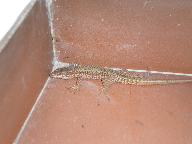 Wir beide waren uns im Endeffekt nicht einig, wer von uns bloeder aus der Waesche schaut. Ich bin der Ansicht, dass ich zullaermindest gut im Rennen lag. Wir Menschen fuehlen uns den Tieren ja zumeist ueberlegen. Aber schaut Euch mal dieses Prachtexemplar an: Der hier versperrte mir den Weg. Mindestens zehn Mal so gross, wie er auf dem Bild erscheint. Ehrlich! Auf meine zaghaften Anfeuerungsrufe hin bewegte er sich langsam in meine Richtung. Nicht gut. Gar nicht gut. Zum Glueck entdeckte ich 50m unterhalb den Hauptweg und verdrueckte mich spontan ins Unterholz. Apropos Respekt vor Tieren. Aber hallo! Der unabdingbare Begleiter immer und ueberall, die Eidechse. Leider musste ich bis zur nachsportiven Dusche warten, ehe ich ein Exemplar vor die Linse bekam. Er fand es bei uns im Bad aber nicht sooo toll. |