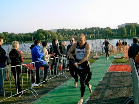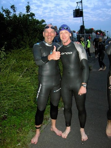 Ich freue mich noch fünf Minuten auf den kommenden Tag und stehe dann auf, bevor meine drei Wecker klingeln (man weiß ja nie.. ;)). Einen Kaffe später sitze ich am Rechner und tippe letzte Zeilen. Zwei Kaffee später bin ich rasiert und geduscht. Ich entscheide mich gegen einen dritten Kaffee, greife meine Beutel und gehe um 20 nach Fünf zur nächsten Ecke, wo mich mein Vereinskollege Torsten um halb sechs abholen wollte. Genügend Zeit, um noch ein paar mal auf und ab zu traben. Die Stimmung und das Wetter sind prima, es verspricht, ein guter Tag zu werden. Kaum habe ich aber meine Beutel abgestellt, taucht auch schon Torstens kleiner Flitzer auf und ich hüpfe rein. Dem Magerhasen ist kalt am frühen Morgen und so fahren wir in subtropischem Klima Richtung Köln. Um diese Uhrzeit noch kein Problem und so sind wir 20 Minuten später am Regattagelände in Köln. Im Gegensatz zu Torsten bin ich völlig ruhig und freue mich schon auf's Schwimmen. Ein bisschen mit den Parkplatz-Wächtern gescherzt und dann das Auto abgestellt. Die 300m bis zur Wechselzone mit einem Pärchen aus dem Süden gequatscht, deren mütterliche Begleitung aufgeregter war als sie selber. Am Check-In dann zielstrebig auf den Menschen mit Zettel in der Hand zugesteuert und tatsächlich, da stand meine Nummer drauf. Er hat dann meinen aktuellen Helm kontrolliert und für gut befunden, bevor er meine Nummer aus der Liste strich. Ich war mir ja nicht sicher, ob die das wirklich machen. Mein Rad vorgefunden, wie ich es am Nachmittag vorher verlassen hatte, die Nachbarn begrüßt und dann eben meinen Platz eingerichtet. In die Schlange für die Nummer gestellt (leider schon wieder ab J) und mit meinem bekannten Jörg aus Hattingen gequatscht, der sich gleich hinter uns einreihte. Ich bin dann noch mal für kleine Jungs, bevor ich runter zum See gegangen bin, um schon mal einen Blick auf's Wasser zu werfen. Wunderschöne ruhige Morgenstimmung, erste Kanuten, die sich warm paddelten, und das alles bei absoluter Windstille und klarem Himmel. Phantastisch. Ihr könnt euch gar nicht vorstellen, was für einen gute und positive Stimmung ich hatte. Ich hätte heulen können vor Freude über den Moment. Einen Runde über's Gelände gelaufen, um zu gucken, ob ich unsere Kollegin Alex finde, die sich für den Start angesagt hatte. Ihr wollte ich mein Laufkäppi und Telefon in die Hand drücken. Aber noch keine Alex in Sicht, aber Zeit, sich langsam in den Neo zu quetschen. Mein Kollege Torsten drückte da schon ein bisschen auf die Tube, aber wir waren noch genau im Plan. Brille in die Radschuhe, Gel geschluckt, Schwimmbrille auf und los ging's nach der Abgabe unserer Wechselbeutel Richtung Start. ![]() Am Schwimmeinstieg stand dann doch die Alex. Also noch kurz ein Foto gemacht und dann über den rutschigen Slip ins Wasser geglitten. Den Torsten hab ich dabei irgendwie aus den Augen verloren, hatte ihm aber schon vorher alles Gute gewünscht. Die Wendeboje lag am Ende der Leine zwischen Bahn Zehn und Bahn Neun. Nach der Erfahrung des Vortages hab ich mich wieder auf Bahn Acht einsortiert, diesmal aber weiter vorne. Das Timing war perfekt: Noch 90 Sekunden bis zum Start. ...5,4,3,2,1, los ging's mit Musik und Feuerwerk. Ich war ruhigen Zuges sofort in freiem Wasser und hab mich ganz auf den Augenblick konzentriert. Mein Atmen..., den Morgenhimmel..., die Wasserlage..., das Strömen des Wassers an meinem Kopf..., meinen Zug..., die sich entfernenden Geräusche..., meinen Beinschlag, einfach alles, um diesen sinnlichen Moment so schön wie möglich zu machen. ![]() Und dann kam langsam die Sonne hinter den Bäumen hoch. Wären meine Augen nicht schon feucht gewesen, in diesem Moment wären sie es bestimmt geworden. Wie spektakulär war das denn? Unglaublich, sich völlig eins mit der Umgebung zu fühlen. Lang und ruhig der Zug, ruhig der Atem und der Puls. Irgendwo an den Leinen einige wenige andere Schwimmer, ich bin über einen Großteil der Bahn völlig frei und alleine. Nach zwei Dritteln der Strecke ziehe ich langsam Richtung Boje, dann ist sie auch schon da. Vier, fünf Leute um mich rum, alles ganz easy, einen Rückenwendezug und schon geht es Richtung Ziel. Immer noch ist alles perfekt, der Puls ist soweit unten, dass mir fast kalt wird im Neo, weder Schulter noch Ellenbogen mucken in irgendeinster Weise. Das ist einer von so vielen Momenten in meinem Leben, in denen ich dem lieben Gott dankbar bin, so etwas erleben zu können. So schwimmen wir dem Ziel entgegen. Die Musik wird langsam lauter, dann ist der Ausstieg in Sicht und schon stehe ich an der Treppe auf und ergreife die Hand, die mir gereicht wird. Nach einer Stunde und zehn Minuten gehe ich über die Matte in den Laufkanal, voller Vorfreude auf mein Frühstück auf dem Rad. Auch wenn es Laufkanal heißt, der Tag ist noch lang und so halte ich mich rechts und gehe ganz entspannt zur Wechselzone. Kurz vorher steht die Alex. Den Daumen hoch, "Alles locker, alles easy." und weiter zum Rad. ![]() Am Zaun steht Elke und spricht mir zu. Das hat mich sehr gefreut. Brille auf, Neo aus, Trikot an, Radhose an, meine Mettwurstbrote in die Trikottaschen, Radschuhe an, Startnummer um, Neo und Schwimmbrille in den dafür vorgesehenen Beutel packen und los ging's. Nach knapp sechs Minuten bin ich wieder raus aus der Wechselzone, nehme ein paar Schritte Anlauf und schwinge mich auf's Rad. ![]() Hach, endlich Frühstück. Ich liege auf dem Auflieger und fange an, die ersten Brote zu esse. Hmm, lecker. Jetzt noch einen Kaffee und es wäre perfekt. Nach gut zwei Kilometern steht die Alex am Rand und klatscht: Daumen hoch, "Alles easy, alles gut." Und weiter geht's über menschenleere Straßen Richtung City. Nach und nach überholen mich andere Radler, dann schließt Keith aus Florida auf und fragt, ob ich einen Kaffee wolle. Würde doch gut zu meinem Brot passen. Ich sehe, wir verstehen uns. Er hat aber leider auch nur Iso dabei, also wird das nichts mit gemeinsamen Frühstückskaffee