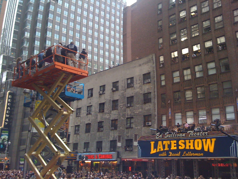 Doch irgendwann ist's auch gut fuer den Tag. Man stoepselt den iPod in die Lauscher und schlappt nach Hause. Heute aber wurde mein Musikgenuss (Euro Trance - man hat abends ja auch noch ein Leben - WACH BLEIBEN!) nicht durch die ueblichen Sirenen gestoert, sondern durch duchdringende Musik. Stoepsel raus und schnell dem Laerm entgegen. Free impromptu concert! Freude darueber links wie rechts: "Helter Skelter" kenn' ich eigentlich von U2, aber hier spielt ein anderer: Der Paule McKart-Nei! Mir blieb nur ein zweiter Song, da ich das Gros wohl verpasst hatte. Gut, bin jetzt auch nicht gerade so der Fan. Paule verschwand also wieder, es senkte sich der Kran und die Leute riefen ploetzlich "Bruuuuus!!". Jetzt war ich natuerlich wieder hellwach. Sollte tatsaechlich der Springstein Bruus zugeschaut haben? Nee, bloss der Willi. Bruus Willi. Hier wunderschoen von hinten mit Baseballkappe zu sehen: Das Ding dahinter, das wie Bruus aussieht, ist bloss der 'BVB', der Boddigaad von Bruus. |