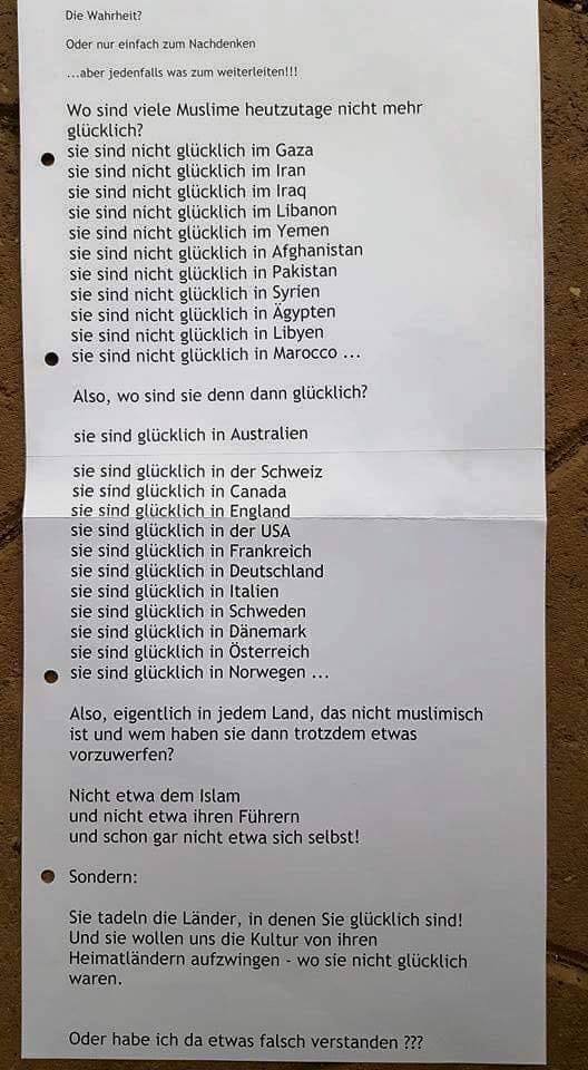Und warum schaffen diese Menschen sich Stadtteile, in denen es abläuft wie in der ehemaligen Heimat, das deutsche Rechtssystem abgelehnt und bekämpft wird, und nur die eigenen Glaubensrichter zur Streitschlichtung akzeptiert werden? In Moscheen offen zur Änderung und zur Abschaffung des säkulären Systemes hier aufgerufen wird und Polizisten bei der Ausübung ihres Berufes tätlich von Grossfamilien in solchen Stadteilen angegriffen werden? Und warum tat und tut unser Herr Innenminister nichts gegen diese Missstände? Und wer braucht kriminelle staatenlose Grossfamilien, die unsere Sozialsysteme, unsere älteren Mitbürger und alles andere, wo immer möglich, ausräubern? Wo ist deren Nutzen für die Gesellschaft hier und heute? Und nun auf die Rolle, Wut wegtrainieren... Omtc T. PS und warum liegt in diesem Text soviel Wahres? |