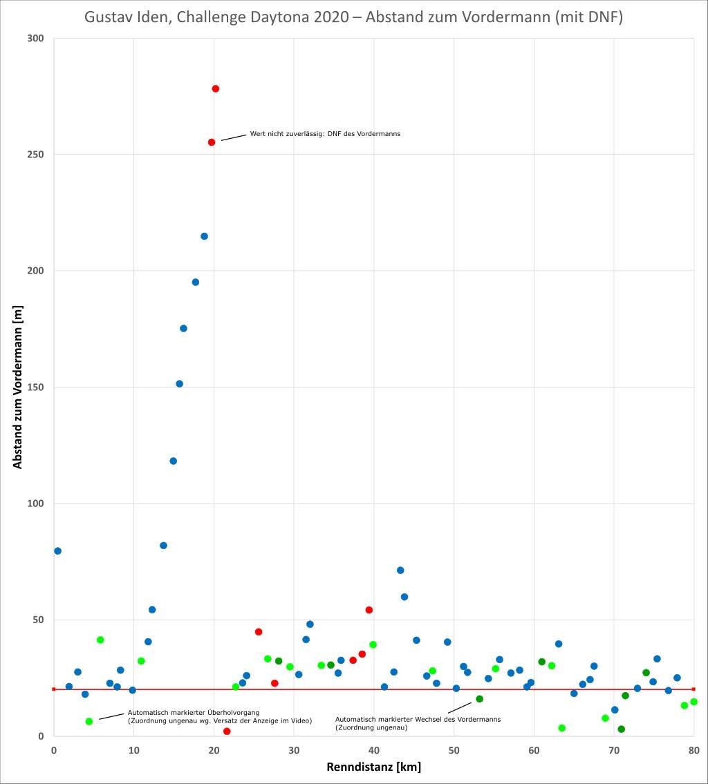 Was die Wattersparnis im Windschatten angeht, so kann ich dazu nichts sagen, aber für mich ist am auffälligsten, dass Idens Abstände zum Vordermann in der ersten Hälfte teilweise enorm waren und in der zweiten Hälfte oft ums Limit herum. Wenn ich spekulieren sollte, würde ich annehmen, dass das nicht ohne Effekt war. Zur Veranschaulichung hier die komplette Skala: Bildinhalt: Gustav Iden - Daytona Abstand, Komplett |