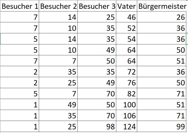 Mal sehen, ob ich sie richtig aufschreiben kann. ;) "Heute waren nur drei Leute im Schwimmbad" sagt der Bademeister zu seinem Kollegen. "Wie alt waren sie denn?" fragt dieser.* "Wenn man ihre Alter multipliziert erhält man 2450, wenn man ihre Alter addiert, sind sie so alt wie dein Vater.", antwortet der Bademeister. Sein Kollege überlegt kurz, "Ich glaube das ist nicht lösbar".* "Ah, stimmt, alle sind jünger als der Bürgermeister". "Okay, jetzt weiß ich es", sagt der Kollege. Wie alt ist der Bürgermeister, wie alt der Vater und wie alt die drei Schwimmbadbesucher? |