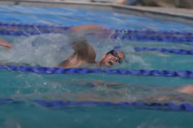 Lionel schwimmt. Seine Rückholphase ist nicht zum Angeben, seine Atmung sieht etwas daneben aus, aber der Bewegungsrhythmus gleicht mehr dem eines Schwimmers als man es sonst von ihm gewohnt ist. Justin Slade ruft Zeiten ins Wasser. Yup! Yup! 49,9, Lionel! Nice job!