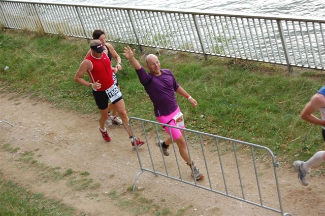 Auf die bereitstehende Bank gesetzt, die angebotenen Hilfe dankend abgelehnt, Radschuhe, Radhose und Helm aus, Laufschuhe an, restlichen Kram wieder in den Beutel, und ab auf die Laufstrecke. Hier herrscht ein bisschen Trubel, so wie es aussieht, alles Freunde und Verwandte der Athleten.