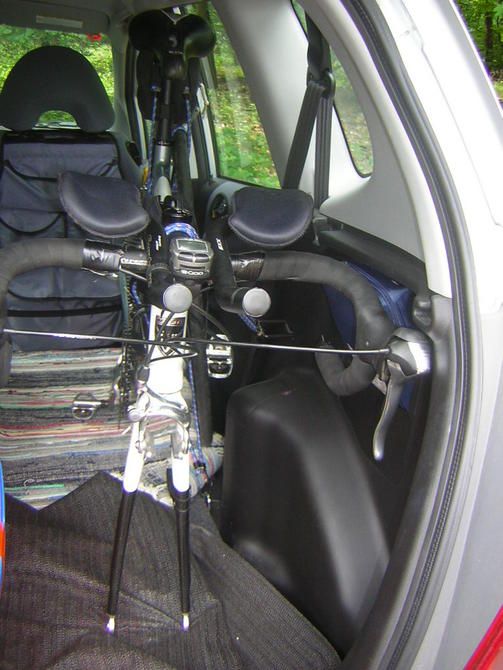 Ich hatte in meiner Anfangszeit als Triathlet einen Fiat Barchetta (Roadster mit 2 Sitzen und Gepäcktasche-Kofferräumchen). Dazu kam ein Quintana Roo OAO Tri-Bike. Nachdem ich das Cabrio-Verdeck umklappte und beide Laufräder des Bikes entfernte, desweiteren die Sattelstütze ausbaute und den Lenker umklappte, passte das Ding auf den Beifahrersitz. Vor dem Kettenschmutz bewahrte eine Alditüte meinen Beifahrersitz. Ein Laufrad verstaute ich dann vor den Beifahrersitz und das andere bei inzwischen wieder geschlossenem Verdeck, hinter den nach vorne verstellten Fahrersitz. Den Neo klemmte ich in das Kofferräumchen mit den Rad- und Laufsachen. So fuhr ich zum Wettkampf und alle guckten ganz komisch.