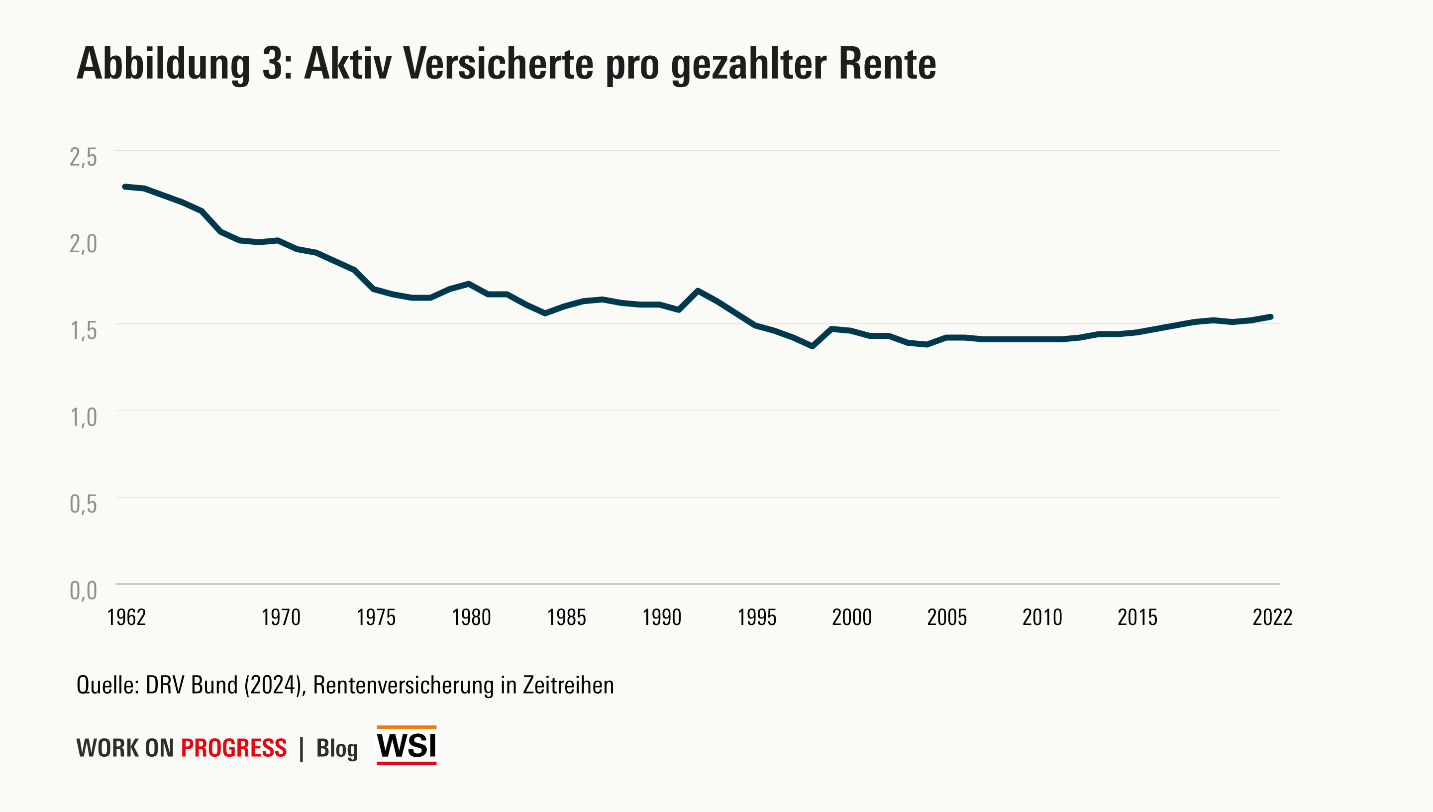 in dem oben verlinkten WSI Blog Eintrag ist als Abbildung 3 eine Grafik eingebettet die mE zeigt, dass das Verhältnis von Einzahler zu Rentner schon jetzt unter das Verhältnis 2:1 gerutscht ist.