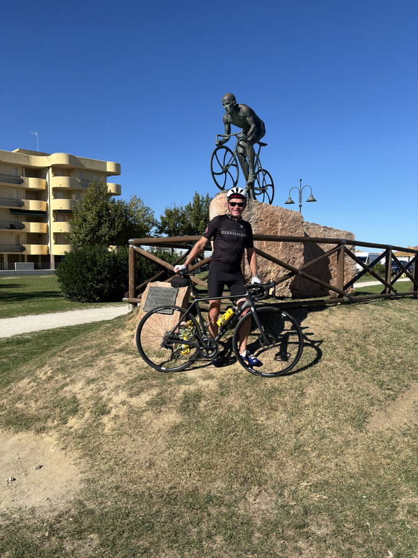 Mit dem Auto von HH nach Cervia, für einen Wettkampf, Schwachsinn, klar, aber Ihr versteht das sicher. Also los, Hotel, Registrierung etc. und ein Wahnsinnswetter. Am Freitag Mittag ein Testschwimmen in Badehose, lief gut. Am Abend, beim Essen, Thema Neoverbot, sage ich aus Kampfrichtersicht: „Die Teilnehmer wünschen Neofreigabe. Der Veranstalter wünscht zufriedene Teilnehmer, also wird man 24 Grad messen.“ Ist legal und regelkonform: an der Wettkampfstrecke (600 m draußen) früh morgens in 1 m Wassertiefe. Genau so kam es auch und ich im Neo am Start. Ich Idiot. Natürlich kam ich mit der Hitze überhaupt nicht klar. Es war so schlimm, dass ich zuerst gar nicht losradeln wollte, nach einem Moment des Innehaltens fiel mir dann aber wieder ein, warum ich in Cervia bin und was ich für einen Aufwand hatte. Also los. Aufpassen in Cervia, Löcher, Blasen und fiese Kiefernwurzeln, nach 20 km die SS3 (E45, im Grunde die A7) in Summe 100 km und 20 km Schleife durch Forlimpopoli. Diese Schleife ist tatsächlich selektiv, eine knackige Rampe. Besonders auf der SS3 ist es ein Grupetto nach dem Anderen und die KRs machen nichts, sie hupen sich nur den Weg frei. Ist auch sinnlos, wo sollen sie denn alle hin? Ich habe da ein gewisses Verständnis, auch für die Athleten: das hat Arne hier mal schön beschrieben, er schafft es nicht, vor dem Pulk wegzufahren und wenn er dahinter geht kommt ein anderer Pulk. Den größten schätze ich auf 150 Athleten.