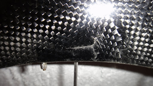In das Hinterrad ist ein kleines Steinchen eingeschlagen, was das Carbon leicht beschädigt hat. Dies ist aber bei der Art Laufrad unproblematisch, weil das Carbon keine tragende Funktion hat. Siehe Foto.
