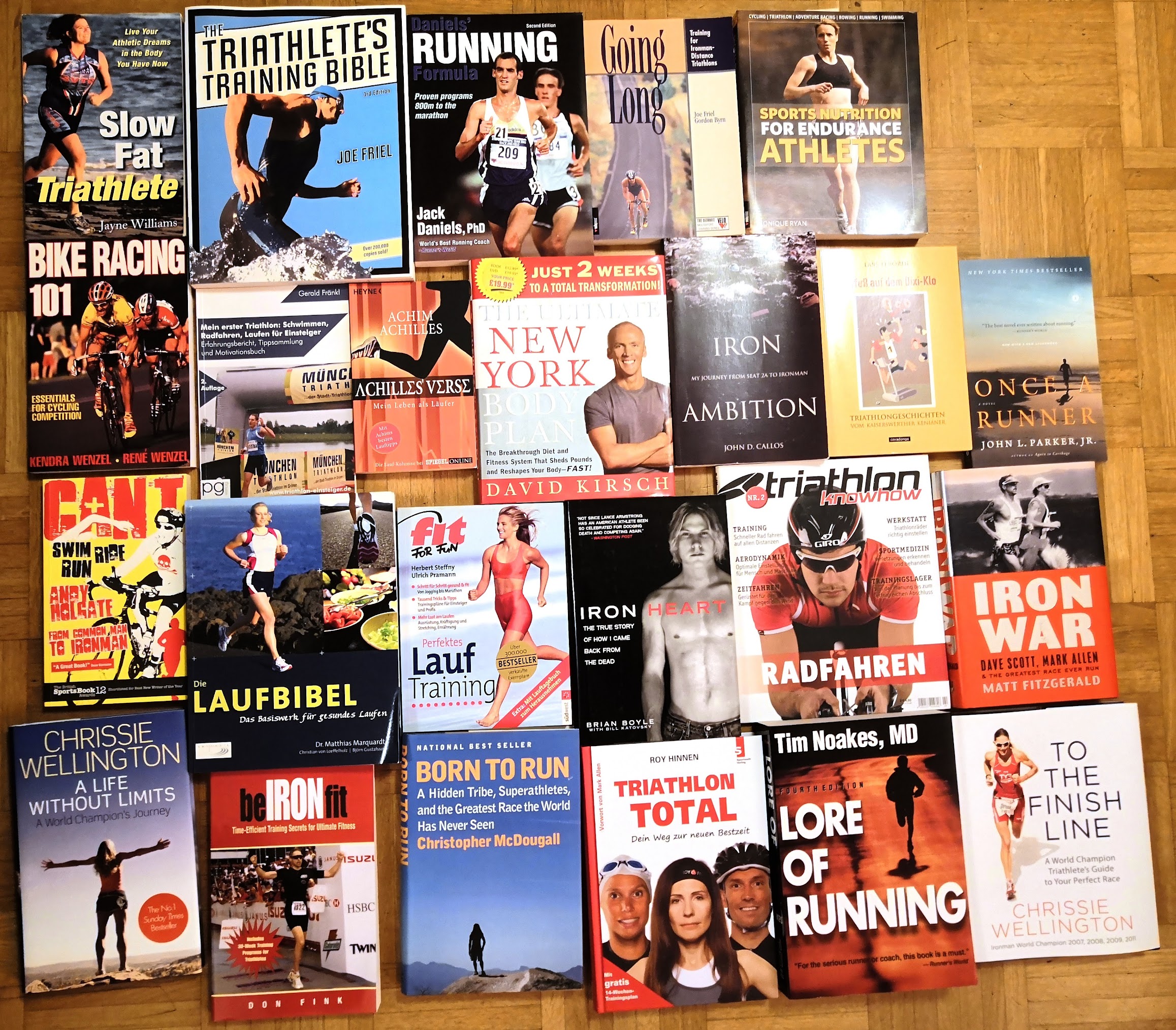 Ich will mich in Rosamunde Pilcher einlesen, also brauche ich Platz im Bücherschrank. Dafür müssen ein paar wenig genutzte oder ausgelesene Sportbücher über die Klinge springen. Von absoluten Klassikern (The Triathlete's Training Bible, Going Long, Lore of Running, Daniel's Running Formula), die immer noch halbwegs aktuell sind bis absolutem Schund (Iron Ambition – trotzdem irgendwie lesenswert, weil man kaum glaubt, was für blasierte Deppen es gibt; allein die Amazon-Bewertungen sind es wert) ist alles dabei. Einige in Deutsch, die meisten englisch.